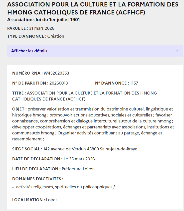 ASSOCIATION POUR LA CULTURE ET LA FORMATION DES HMONG CATHOLIQUES DE FRANCE (ACFHCF)